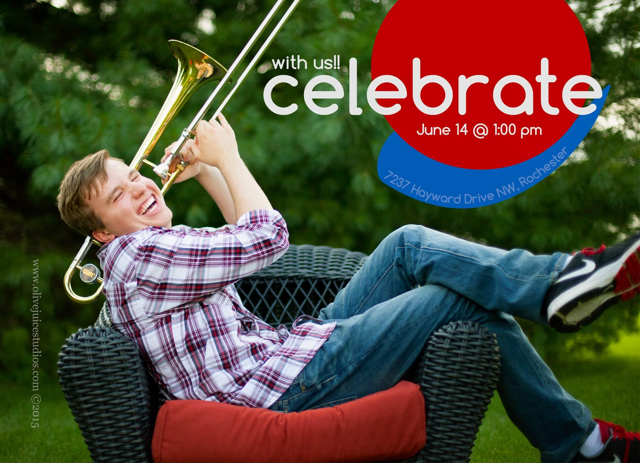 Sam worked as a camp counselor every summer and loved it. His happy place was the camp, but it was five hours away. So, Scott found camp-like settings in and around Rochester. Sam chose outfits to match the theme (plaid flannel, blue denim). The front of his graduation card shows him sitting in front of a wood, cabin-like building. The back shows him rowing a boat on a quiet creek. The camp was never in the photos. The feeling of the camp was in every single one.